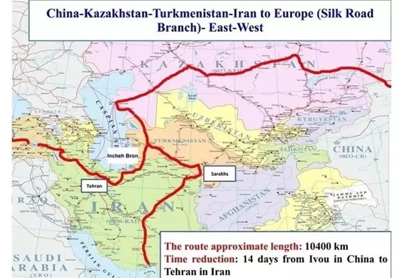 Už fungujúca nadregionálna železničná trať Urumči (ČĽR) – Alma-Ata (Kazachstan) – Biškek (Kirgizsko) – Taškent (Uzbekistan) – Ašchabad (Turkménsko) – Serach – Mašhad – Teherán s dĺžkou približne 11 000 km je jednou z hlavných logistických súčastí projektu koridoru Čína – Irán – Turecko – Európa.