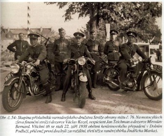 Necelých 500 metrů od nádraží, na křižovatce, kde stojí benzinové čerpadlo, se mužstvo setká se třemi příslušníky SOS, Janem Teichmanem, Václavem Kozlem a Miroslavem Bernardem, kteří zde zastavili, aby doplnili benzin do svých motocyklů. V tu chvíli z protější strany od lesa vyráží nečekaně asi třicet ozbrojených ordnerů. Z bezprostřední blízkosti zahajují na motocyklisty palbu. Všichni tři muži padají k zemi. Finanční strážmistr Václav Kozel krvácí s prsou a chroptí, dozorce finanční stráže Bernard leží opodál. Respicienta Teichmana není vidět.