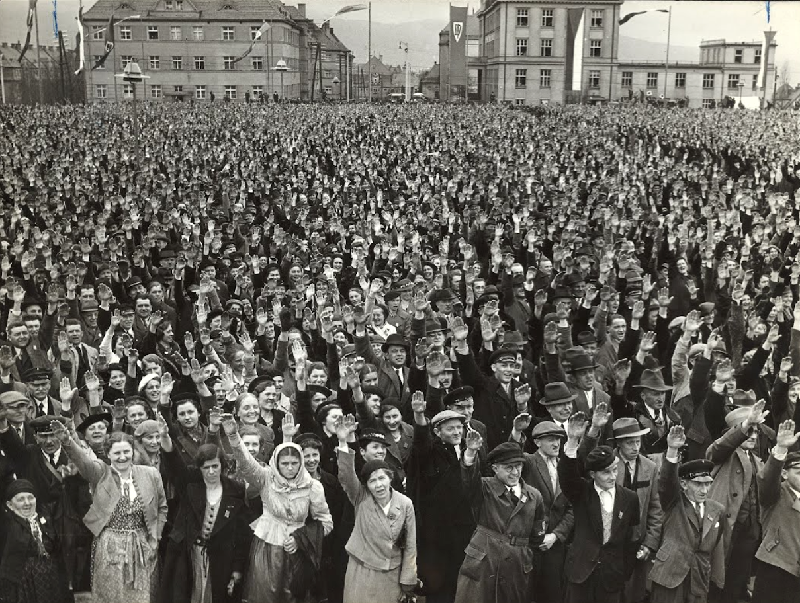 ...se objevoval les zdvižených rukou, který z tisícihlavého davu skandoval: „Sieg Heil.“